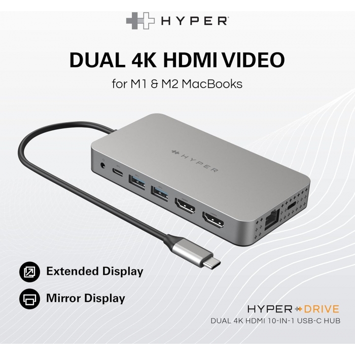 Découvrez la toute nouvelle façon d’étendre la connectivité des MacBook M1/M2. Avec le Dual 4K HDMI 10-in-1 USB-C Hub, vous pouvez étendre à 2 écrans à la vidéo 4K tout en ayant accès à 10 ports essentiels, y compris USB-C, HDMI, USB-A, et bien plus encore. Profitez du transfert de photos en un clin d’œil, de la recharge rapide de votre appareil et de l’extension à 2 écrans HDMI, le tout sans avoir à télécharger des pilotes encombrants. De plus, il est entièrement compatible avec les appareils MacBook Air/Pro (M1/M2 et Intel powered), les appareils Windows PC ainsi que les Chromebook.